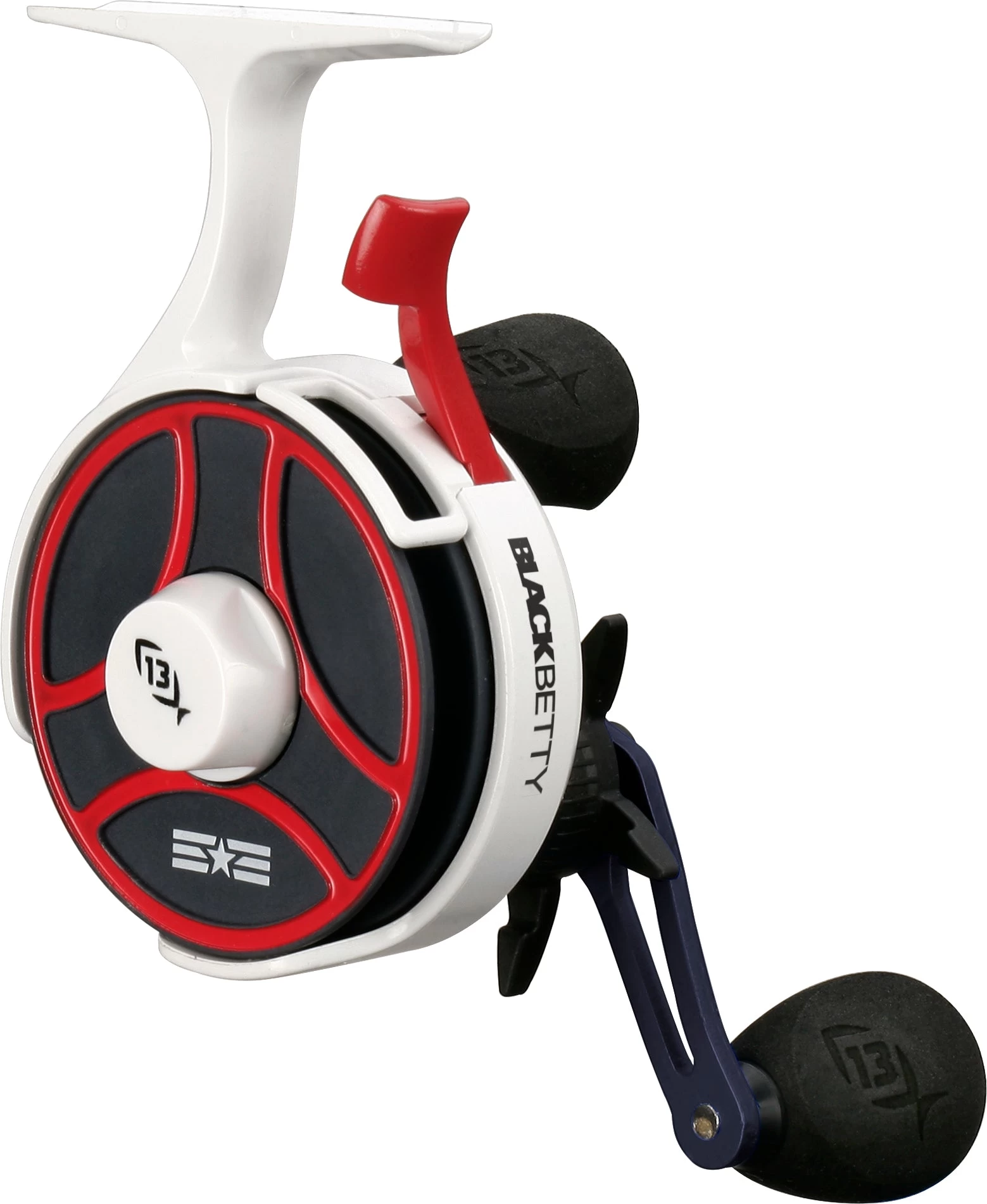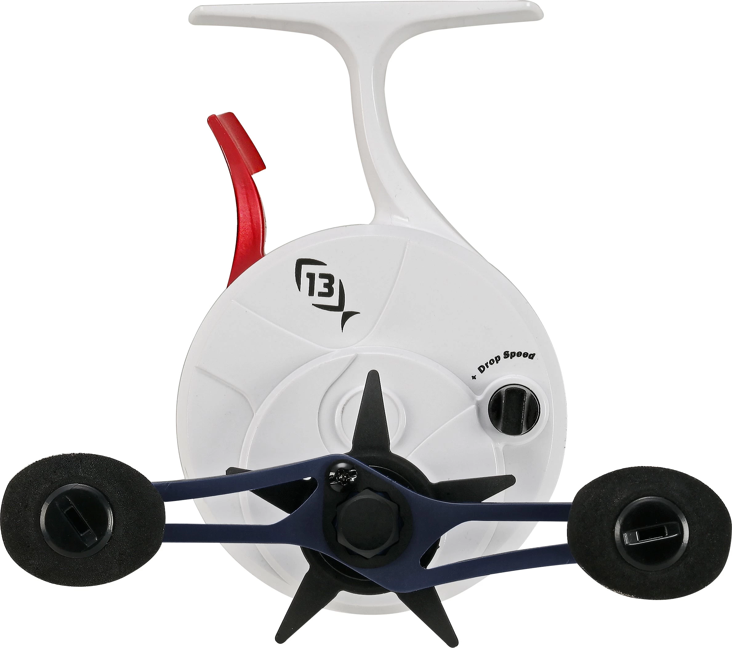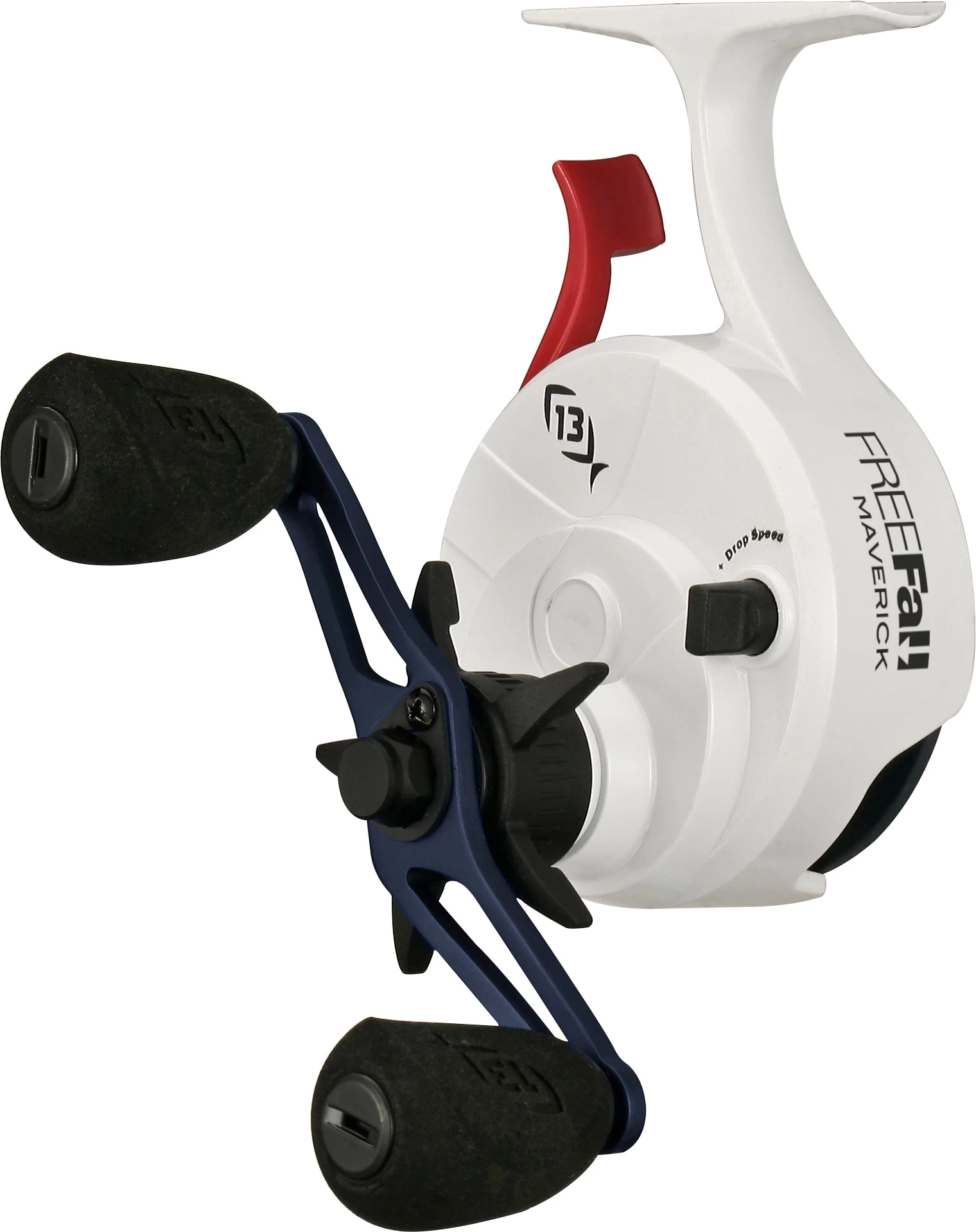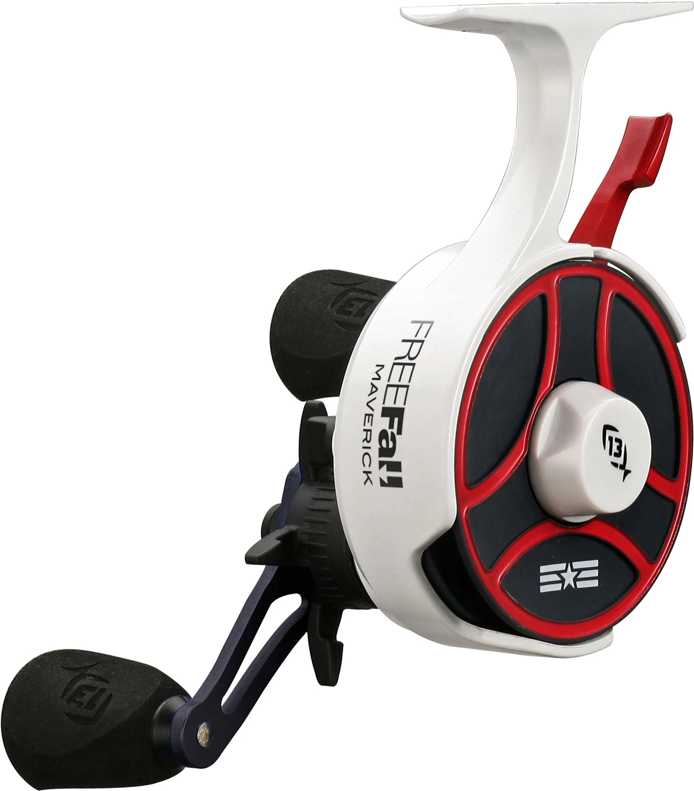 The 13 Fishing FreeFall Ghost Maverick Ice Reel provides the angler with a sharp red, white, and blue color scheme so you can show off your USA pride! As with the original Ghost reel, this version is equipped with the FreeFall trigger so you can stop at the exact depth you want. Once you hit your desired depth, release the trigger, and get ready for instant hookups! The 2.5:1 gear ratio provides a smooth drag perfect for shallow to medium depth ice fishing. With the drop-speed control and the tangle-free spool cap, this reel is extremely user-friendly and can easily be operated using one hand – allowing you to keep your other hand warm for later!